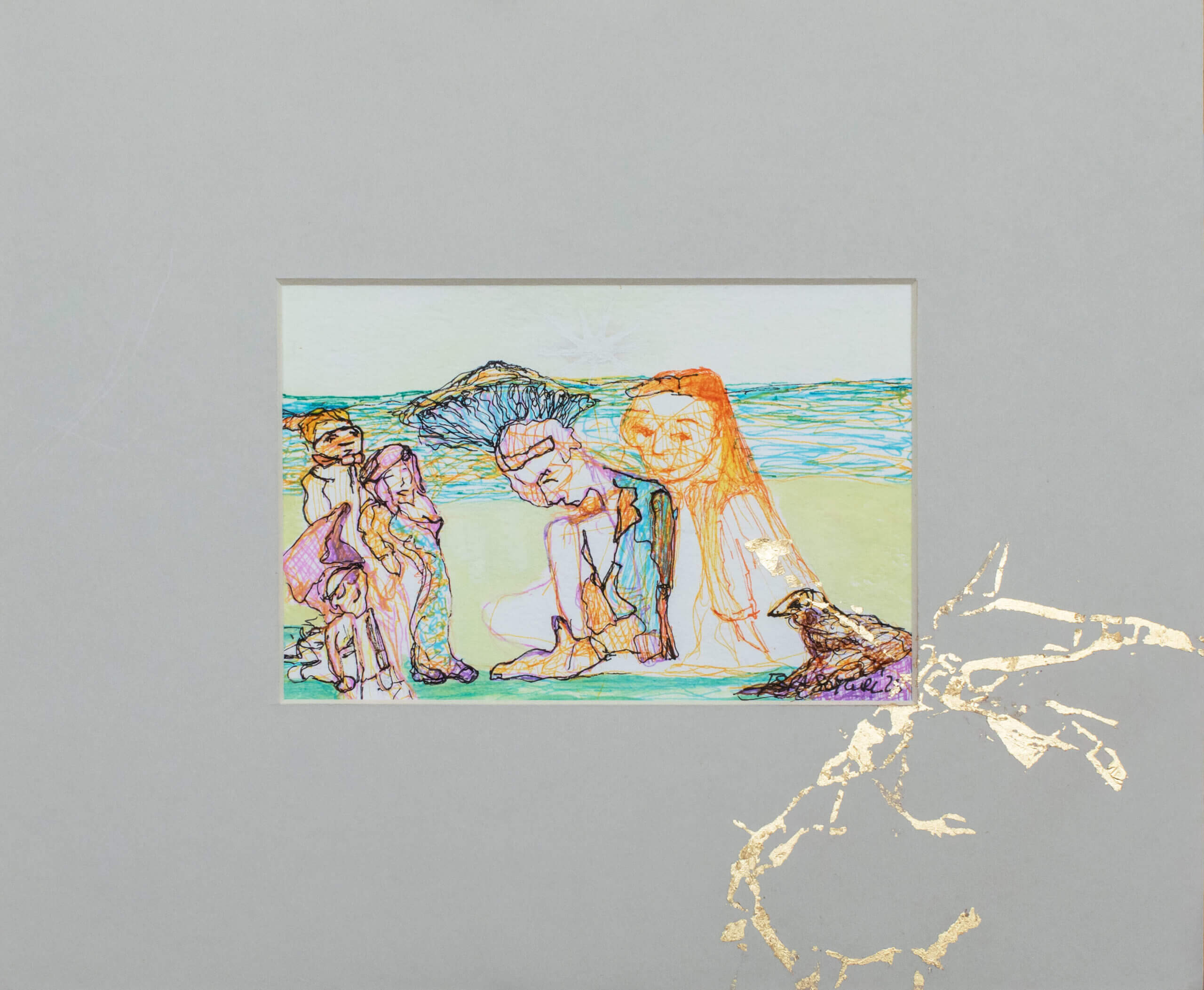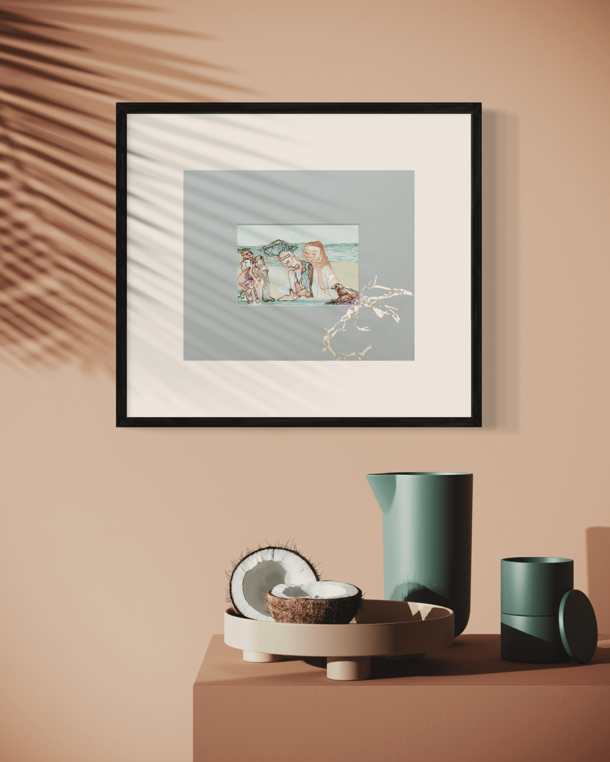 Esra Soytürk’ün “Cariyeler” adlı bu küçük boyutlu eseri, tarihsel belleğin ve kadının toplumsal temsillerinin iç içe geçtiği şiirsel bir anlatı sunar. Deniz kenarındaki figürler, bir yandan özgürlükle ilişkilendirilen bir doğa ortamındayken, diğer yandan duruşları ve ifadeleriyle sınırlanmışlık hissi yaratır. Gözleri kapalı ya da yere bakan figürler, içe dönüklüğün ve boyun eğmenin görsel temsilleri hâline gelir.