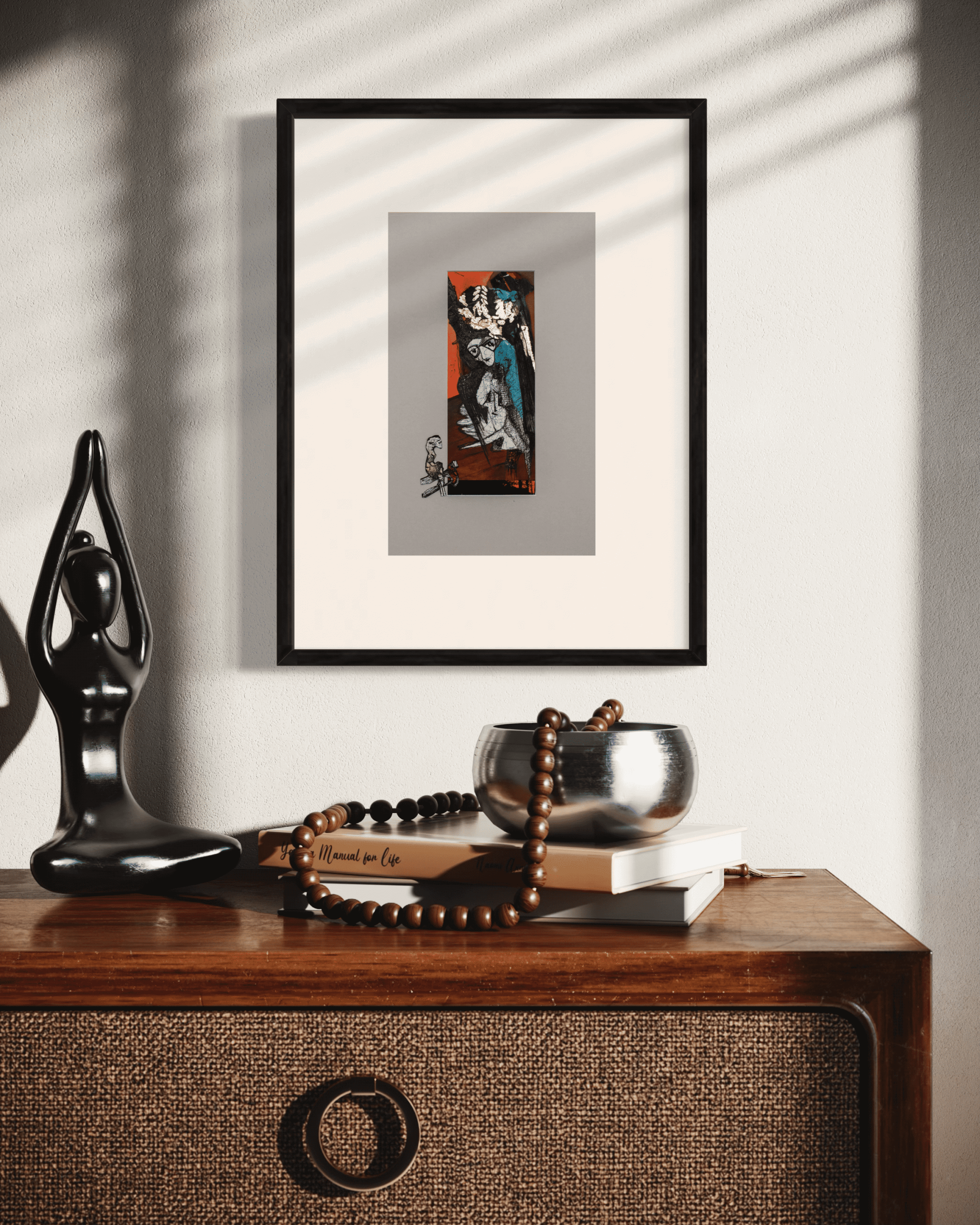 Kağıt üzeri karışık teknik kullanımı sayesinde doku ve renk geçişleri oldukça katmanlı bir ifade oluşturur. Sol alttaki küçük figür, dışlanmış ya da unutulmuş bir parça gibi kompozisyona dahil edilirken; kırmızı ve turuncu tonlar duygusal bir ısınma yaratır. “Kırmızı Balık”, fark edilmek isteyen ama kendi derinliklerinde yüzmeye devam eden bir benliğin sembolüdür.