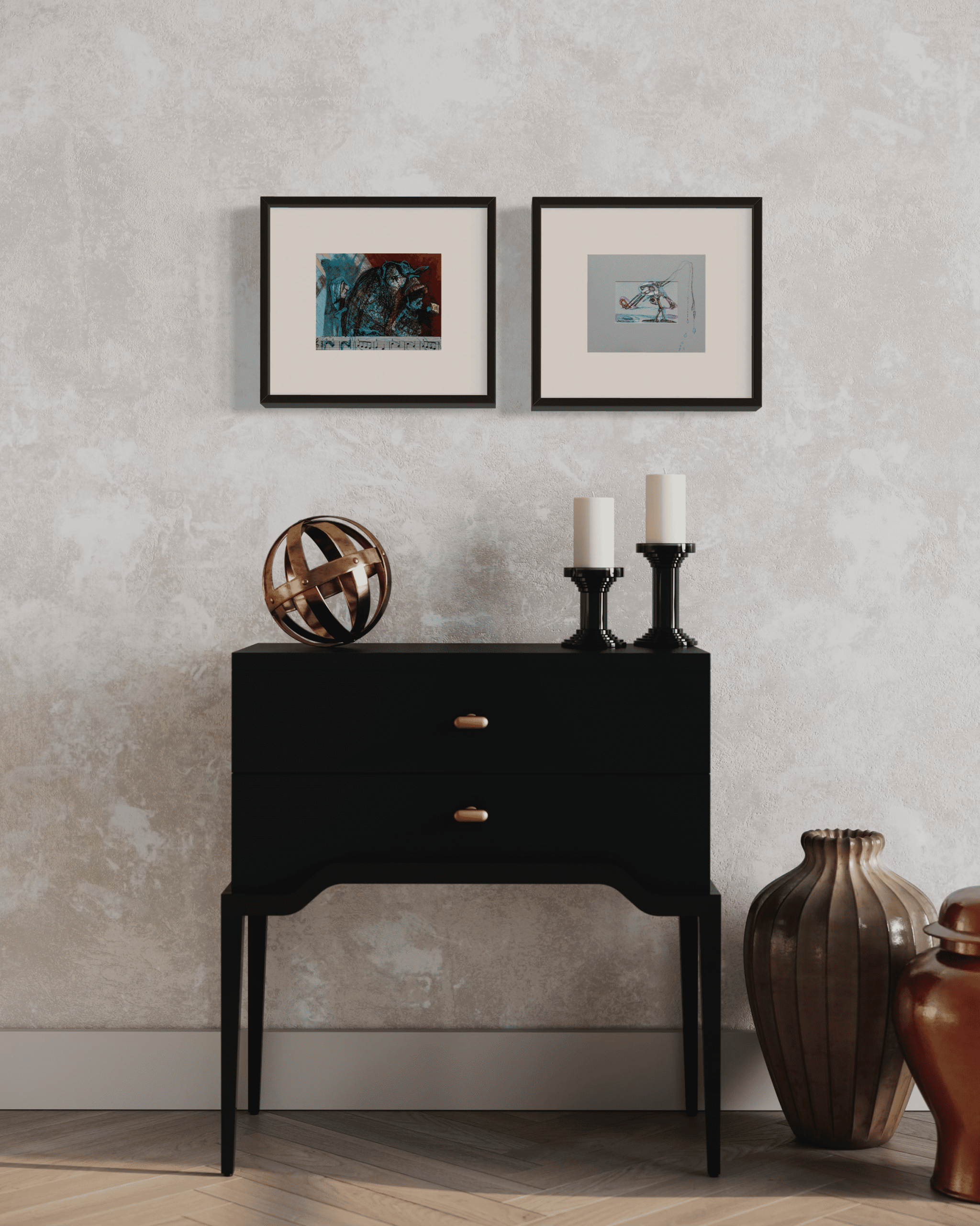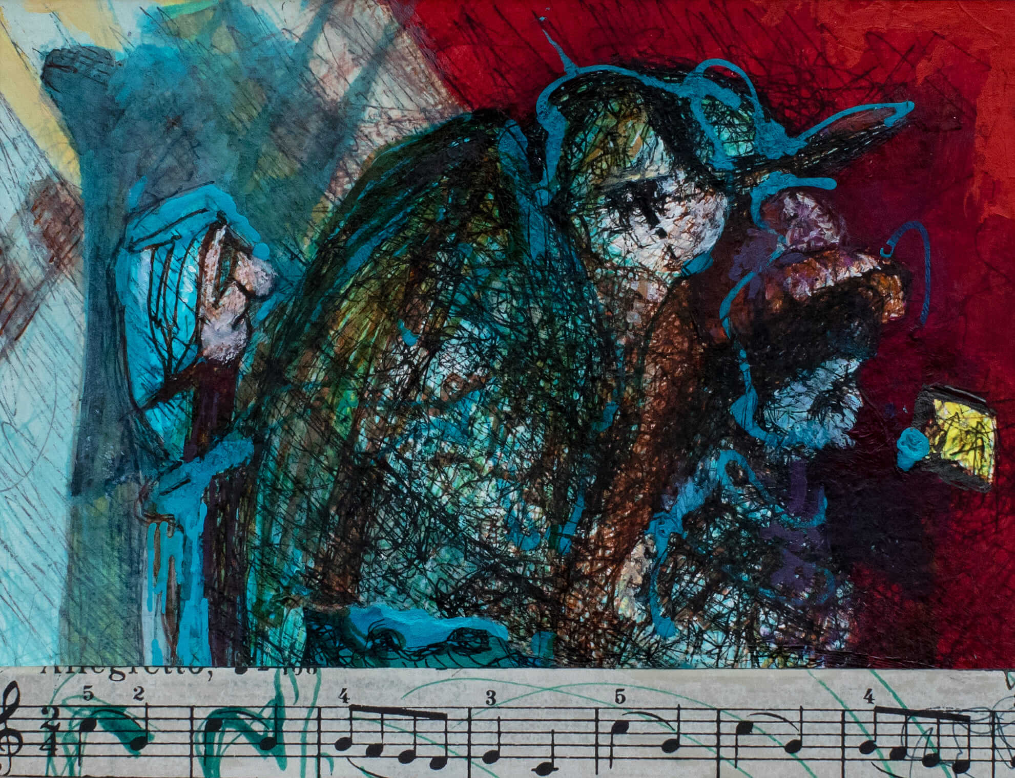 Yoğun kırmızı arka plan ve turkuaz tonların etkileşimi, hem bir çatışmayı hem de ahenkli bir birlikteliği çağrıştırıyor. Figürlerin yüz ifadeleri, birer nota gibi duygusal geçişler barındırıyor.